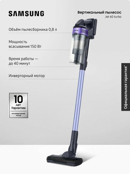 Вертикальный пылесос Samsung VS15A6031R4/EV сочетает в себе передовые технологии и продуманный дизайн. Инверторный мотор бытового прибора для дома с мощностью всасывания до 150 Вт и аэродинамическая система фильтрации эффективно устраняют пыль и загрязнения даже на самых сложных поверхностях. Технология Jet Cyclone поддерживает стабильную мощность всасывания, обеспечивая постоянную эффективность работы. Насадка напольного пылесоса Jet Fit с поворотной головкой на 180 градусов легко справляется с уборкой как на ковровых, так и на твердых покрытиях, обеспечивая максимальное удобство. Многослойная система фильтрации аккумуляторного пылесоса задерживает 99,999% пыли и аллергенов, создавая в вашем доме чистый и свежий воздух. Высококачественный мощный аккумулятор емкостью 1800 мАч обеспечивает до 40 минут работы без подзарядки, а после 500 циклов зарядки сохраняет до 70% своей первоначальной мощности. Удобная зарядная станция 2-в-1 позволяет хранить и заряжать пылесос в любом удобном месте, не занимая много места. Легко и удобно: беспроводной пылесос весит всего 1,48 кг, что снижает нагрузку на запястья и делает уборку еще более удобной. Создайте атмосферу чистоты и уюта в вашем доме с пылесосом Samsung!