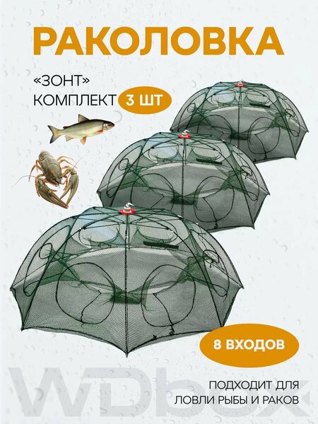 Раколовки для рыбалки зонт от WDbox представляют собой уникальное решение для любителей активного отдыха и спортивной ловли. В комплекте идут 3 штуки. Раколовки выполнены в форме зонта, что обеспечивает удобство использования и позволяет быстро установить их на любой поверхности. Темно-зеленый цвет делает их практически незаметными на фоне окружающей среды, что повышает шансы на удачный улов. Раколовки оснащены 8 входами, что обеспечивает широкий охват территории и позволяет ловить сразу несколько видов рыб. Материал изготовления - полиэстер, который отличается высокой прочностью и долговечностью. Раколовки подходят для использования в любое время года, что делает их отличным выбором для любителей рыбалки в любых погодных условиях. Размеры раколовок составляют 90 см в длину и 35 см в ширину, что делает их удобными для транспортировки и хранения. Вес комплекта составляет 900 грамм, что делает его легким и удобным для переноски. Выбирая раколовки для рыбалки зонт от WDbox, вы получаете надежный и удобный инструмент для успешной рыбалки в любых условиях.