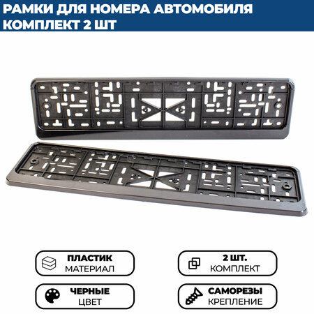 Рамка для номера автомобиля пластиковая черная комплект 2 шт. улучшит вид передней и задней части автомобиля. Качественный эластичный абс-пластик, окрашенный в черный цвет, гарантируют прочность крепления госномера. Рамка для номера автомобиля изготавливается из качественного пластика черного цвета, надежно прикрепляет госномер к бамперу или кузову автомобиля любой модели. Эти рамки госномера применяются для крепления госномера стандартной формы согласно ГОСТ Тип 1 размер 520х112 мм. Номерные рамки автомобильный - модный и популярный атрибут тюнинга автомобилей. АБС-пластик основы рамки - гибкий и эластичный, долговечный материал, не подвержен коррозии, не деформируется при экстремальных температурах зимой или летом. Рамки для авто черные легко настроить под госномер стандартный прямоугольный. Номер фиксируется четко и крепко, не дребезжит при движении, и включенной музыке. Преимущества рамки госномера :