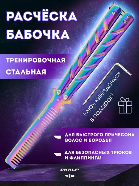 Складная тонкая расческа балисонг с частыми железными зубьями в расцветке масляный градиент. Отличный аксессуар для мужчин и мальчиков любого возраста. Может использоваться как в качестве инструмента по уходу за волосами на голове, так для расчесывания усов или бороды. Клинок этого раскладного гребешка не заточен и поэтому абсолютно безопасен, так как не может случайно травмировать своего владельца во время эксплуатации. Несмотря на яркий внешний вид, эта нож-бабочка может стать отличным трюковым ножом для детей. Его тупое лезвие крепится к двум металлическим рукоятям посредством винтов. Такая фиксация обеспечивает плавное вращение без люфта и расшатывания. При необходимости крепежный узел можно подтянуть Г-образным ключом, входящим в комплект. Внешне эта игрушка для детей (подойдет и школьнику 7, 8, 9 лет) напоминает нож из арсенала игры Standoff 2 или КС ГО ( CS Go ), поэтому игрушечное орудие может стать отличным подарком каждому ценителю сетевых шутеров. Изготовленная в виде балисонга, карманная складная мини расчëска при этом компактная. Вы всегда можете носить её при себе в сумке или кармане. Прямое плоское лезвие без заточки с мелкими зубчиками надежно фиксируется между рукоятями и в сложенном состоянии занимает минимум места. Такая расческа бабочка легко справится с расчесыванием длинных или коротких волос и не травмирует кожу. Тот факт, что клинок бабочки не острый, не заточенный, позволяет безопасно использовать его в качестве тренировочного без вероятности случайного пореза. Эта маленькая, красивая, мужская расческа может также послужить подарочным сувениром ребенку, как нож прикол. И как ножик бабочка детский, и как часть дорожного набора она станет идеальным спутником в поездках или в обычной жизни. Другие модели складных расчесок и большое количество товаров для спорта, туризма и отдыха с хорошей скидкой вы можете прямо сейчас купить в каталоге магазина «Ножемир». ----- Технические данные: общая длина, мм: 221; длина клинка (до рукояти), мм: 99; длина рабочей части расчески, мм: 80; высота зубчиков, мм: 10; толщина клинка, мм: 1,5; сталь: 440; твёрдость стали, HRC: 55 - 56; размер в сложенном виде, см: 12,9 х 3,2 х 1; масса, гр: 116; материал рукояти: металл; особенность: в комплекте Г-образный ключ TORX T7 для подкручивания болтиков; упаковка: картонная коробка.