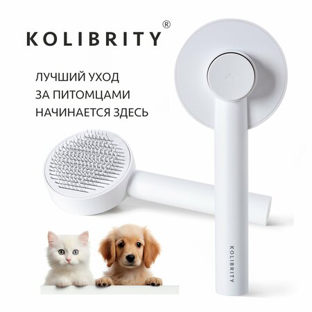 Расческа для кошек и собак KOLIBRITY белая, чесалка, пуходерка, щетка для вычесывания животных с кнопкой самоочистки