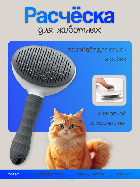 Расческа для кошек и собак, пуходёрка, дешеддер, чесалка с кнопкой самоочистки — незаменимый инструмент для ухода за шерстью вашего любимца. Изготовленная из прочного ABS-пластика, она эффективно удаляет выпавшую шерсть, предотвращая образование колтунов и спутывания. Благодаря своей конструкции из уникальных игольчатых зубьев оснащенных специальными прорезиненными наконечниками расческа обеспечивает массажный эффект, делая процедуру расчесывания приятной для вашего питомца, а затем одним нажатием на кнопку, расположенную на задней стороне корпуса, легко очищается от шерсти. Подходит для использования на кошках, собаках и лошадях. Способ применения: 1-2 раза в неделю используйте расческу для вычёсывания домашнего животного по направлению роста волос; проведите расческой 2-3 раза, прикладывая небольшие усилия для проникновения зубчиков расчески для груминга вглубь шерсти; после использования промойте проточной водой.