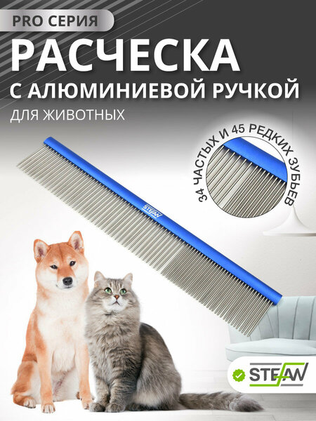 Специальный дизайн расчески позволяет сократить расходы на инструменты по уходу за шерстью Вашего питомца. Сторона расчески с частыми узкими зубьями предназначена для работы в области глаз, ушей и других местах с короткой шерстью. Более редкие зубья отлично подойдут для вычесывания тела, хвоста и т. д. Металлическая расческа для кошек и собак с длинной шерстью, для животных крупных, мелких и средних пород. Расческа подходит для вычесывания шерсти в домашних условиях и груминг салоне. Рекомендации по применению: 1. Начинайте расчесывать питомца стороной с более редкими зубьями. Делайте мягкие поглаживающие движения по направлению роста волос. Начинайте с головы и постепенно двигайтесь к хвосту питомца. 2. Особое внимание уделите чувствительным местам на животе, лапах и хвосте. При обнаружении колтуна не прикладывайте большие усилия, чтобы сразу прочесать его. 3. Избегайте повторяющихся сильных нажимов в одном и том же месте. Если Вы заметите покраснение или раздражение на коже питомца, процедуру следует прекратить. 4. В завершение ухода прочешите Вашего питомца стороной с частыми зубьями для достижения лучшего результата. 5. Очищайте, промывайте и просушивайте инструмент после каждого использования. Размер рабочей поверхности 250мм высота зубцов -35мм Длина частых зубьев-80мм Длина редких зубьев -165мм Диаметр зуба 1,2, у основания 1,5 Растояние между частыми зубьями 1,5 между редкими -3мм