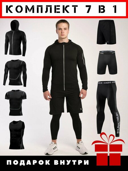 Рашгард 7 в 1 универсальная компрессионная форма для фитнеса, единоборств, кроссфита, мма, бокса, бега, хоккея и других тренировок. Комплект защиты включает: лонгслив; спортивные штаны или тайтсы (леггинсы, лосины, тайтсы); шорты; худи, толстовка; футболка Униформа пользуется огромным спросом из-за своих исключительных достоинств: удобный фасон; стильный минималистичный дизайн; полному отсутствию травмоопасных элементов в виде швов, молний и других вариаций застежек; высокой гигроскопичности и неприхотливости в уходе. Вещи плотно прилегает к телу, не стесняет движений и обеспечивает тренировкам максимальную степень гигиеничности и комфорта. Обтягивающая велоодежда защищает кожу от ссадин, царапин и прочих механических повреждений. Форма выполнена из инновационного текстиля усиленной прочности. Набор 7 в 1 прекрасно отводит пот, поддерживает оптимальную температуру тела спортсмена и препятствует получению травм во время занятий. Хороший подарок отцу, мужу, сыну, парню, другу.