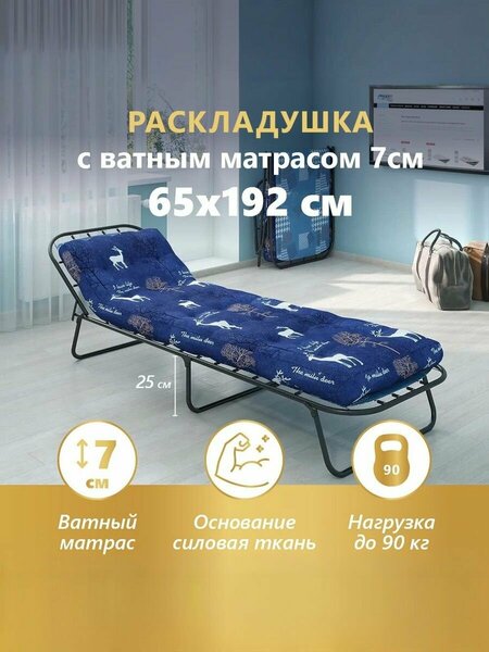 Раскладушка на силовой ткани- 1шт, ватный матрас(эконом) чехол полиэстер-1шт