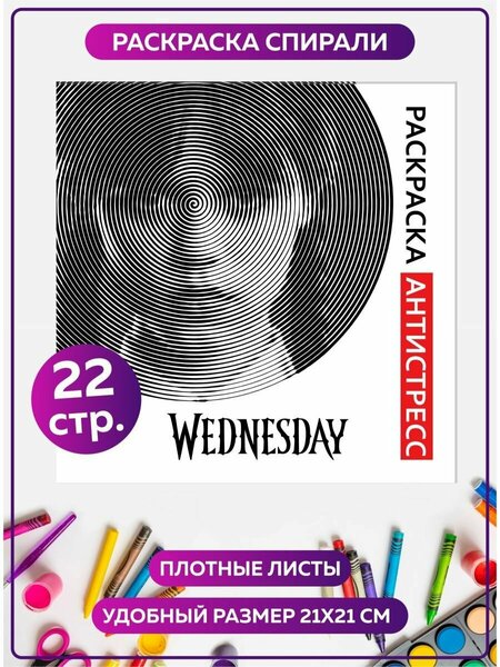 Раскраска антистресс Уэнсдей Wednesday семейка Аддамс Addams - это книга для раскрашивания, где изображение нужно раскрашивать по спирали, которая изменяется по ширине по мере её скручивания к центру. Раскрашивание спиральных картинок станет увлекательным занятием для развития мальчикам и девочкам, так и взрослым. Раскраски антистресс - отличная альтернатива большому игровому картонному домику, дом раскраска картонный, многоразовой водной раскраски водой, аквараскраскам, раскраске по номерам и водяным раскраскам. Приятный подарок сестре или внучке на день рождения, на 8 марта – это наша раскраска для девочек. Разукрашка антистресс идеальна для снятия напряжения и успокоения в конце учебного дня. У наших раскрасок яркий дизайн обложек и плотные страницы. Детские раскраски, станут отличным хобби для женщин, для мужчин и для их детей. Раскраска для взрослого – это самый доступный способ для снятия напряжения, усталости и стресса после рабочего дня. Это возможность, оставаясь взрослым, вернуться в детство и почувствовать удовольствие от самого процесса деятельности, свойственные детям. Раскраска большая, позволяет проявить фантазию и творческие способности. В ней можно выбирать цвета самостоятельно, опираясь на свой вкус и настроение. Раскрашивание мелких деталей в раскраске для детей, развивает мелкую моторику рук и внимательность, прививает аккуратность ребенку. Удобный и компактный размер книги, позволит взять ее с собой в дорогу, в машину или в отпуск. Раскраска антистресс для взрослых, поможет выплеснуть негатив и поднять настроение вам и вашему малышу. Оригинальный подарок брату или внуку на праздник 23 февраля или на праздник с днем рождения, станет наша раскраска для мальчиков. Это интересное занятие развивает у ребенка воображение, ассоциативное мышление, внимание и художественный вкус. Раскраски для девочек и разукрашки для мальчиков – прекрасный вариант детского досуга и хорошее хобби для ваших детей. Раскраски для взрослых, отличный способ отвлечься от гаджетов, а главное, интересно и с пользой провести вместе время. Раскрашивание картинок позволяет развить не только мелкую моторику детской руки, но и сделать кисть более гибкой, что в дальнейшем поможет малышу в освоении письма. Детское раскрашивание, это не просто развлечение, а это еще и шикарное развитие ребенка. Интерес к такому замечательному занятию пропасть не может. Разукрашку для девочек, Вы можете подарить как необычный подарок подруге, подарок без повода, просто так. Раскраски для мальчиков, прикольный подарок другу или подростку ко дню рождения. Веселая семейная игра, которая подарит настроение радости и вызовет бурные эмоции у детей, это наша раскраска для малышей и для взрослых. На память останутся не только цветные рисунки, но и приятные воспоминания. Раскраски для взрослых не займут много места в сумке или в портфеле, их можно брать с собой в школу или в дальние поездки, чтобы всегда иметь под рукой развивающее интересное занятие для себя и для ребенка. Расскраски имеют презентабельный внешний вид, поэтому отлично подойдут для подарка. Подарите детям восторг, а себе часы свободного времени. Раскраска научит вашего ребенка внимательности и усидчивости, это полезное творчество для детей. Наша разукрашка – это книга для детей школьного и дошколь