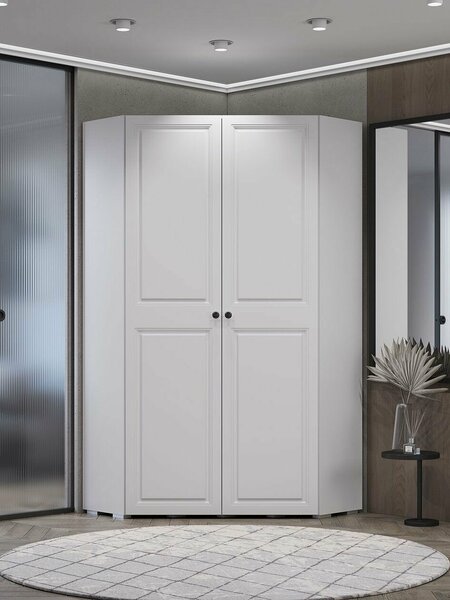 Угловой шкаф Ария — отличный вариант для прихожей, позволяющий максимально эффективно использовать пространство. Благодаря увеличенной глубине, в нём можно разместить множество вещей: от одежды до чемоданов и объёмных одеял. Элегантные фасады с фрезеровкой придают модели особый шарм. Характеристики: материал корпуса: ЛДСП; материал фасадов: МДФ; материал ручек: металл; тип штанги: продольная; ориентация сборки: только так, как показано на изображении; максимальная нагрузка на полку: 5 кг; максимальная нагрузка на штангу: 10 кг.