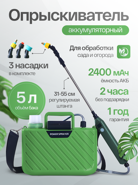 Универсальный аккумуляторный опрыскиватель Power Sprayer — это надёжный помощник для обработки сада, огорода и бытовых нужд. Оснащён мощной Li-ion батареей 2400 мАч, он обеспечивает до 2 часов автономной работы без подзарядки. Благодаря плечевому ремню и лёгкому корпусу весом всего 2 кг, вы сможете комфортно обрабатывать растения, мыть поверхности или проводить дезинфекцию, не испытывая усталости. Преимущества: ✅ Емкость бака 5 л — идеален для работы на даче, в саду или на участке ✅ 3 сменные насадки в комплекте: струйная, душ с 6 отверстиями и веерная — под любые задачи ✅ Тelesкопическая штанга (31–55 см) — удобно регулировать длину для труднодоступных мест ✅ Мощный аккумулятор 2400 мАч (3.7 В) — до 2 часов работы без подзарядки ✅ Зарядка через USB Type-C с влагозащитой — можно заряжать от любого стандартного адаптера 5 В / 1 А ✅ Широкая горловина с фильтром — удобно заливать жидкости, исключая попадание мусора ✅ Плечевой ремень — спина не устаёт даже при длительном использовании ✅ Мерная шкала на баке — контроль объема и расхода жидкости Где применяется: