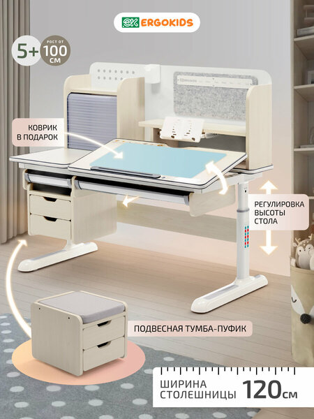 Детский письменный стол для школьника Ergokids Winnipeg Multicolor - это ортопедическая мебель, которая заботится о здоровье и осанке вашего ребенка. Стол рассчитан на детей в возрасте от 5 лет. Максимальная высота столешницы 78 см. Конструкция стола крепкая и надежная благодаря металлическому каркасу. Регулируемая парта-трансформер превосходит по всем параметрам обычный письменный, компьютерный или складной столик. Многофункциональная столешница регулируется под разным углом наклона, угол можно легко регулировать с помощью надежного газлифта. Вы можете установить оптимальный угол наклона столешницы, это удобно для выполнения домашних заданий и работы за столом, будь то школьные уроки, учеба, развивающие занятия с игрушками Монтессори или рисование кисточками, творчество. На каркасе стола с любой из сторон крепится металлический крючок. Стол письменный для школьника Ergokids Winnipeg Multicolor оснащен полкой-надстройкой, состоящей из разных частей: на металлической части можно крепить заметки с помощью магнитов, на тканевой - с помощью канцелярских булавок. Многофункциональность этой полки также обусловлена наличием еще двух небольших полок для принадлежностей и выдвижной подставкой для книг. Уникальной особенностью стола письменного для школьника Ergokids Winnipeg Multicolor является ниша для хранения с ролетом. Стол оснащен двумя выдвижными органайзерами для школьных принадлежностей, выполненными из прочного ABS-пластика. Главной особенностью стола Ergokids Winnipeg Multicolor является съемная подвесная тумба, которая может использоваться не только в качестве ящика для хранения, а также как дополнительное сиденье для родителя. Для удобства к тумбе прилагается мягкая подушка и колесики. Преимущества стола Ergokids Winnipeg Multicolor: Многофункциональная полка-надстройка с выдвижной подставкой для книг Ниша с ролетом для хранения вещей Съемная тумба с ящиками для хранения Надежный механизм газлифт для регулировки высоты стола Металлический крючок (держатель) для портфеля или спортивной формы Высота стола регулируется с помощью червячного механизма ручкой Два удобных и вместительных органайзера из ABS-пластика Прорезиненный барьер-накладка для предотвращения скатывания канцтоваров и тетрадей Создайте комфортные условия для раскрытия потенциала вашего ребёнка с мебелью Ergokids!