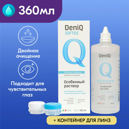 DenIQ Softos – итальянский многофункциональный раствор для ухода за всеми типами мягких контактных линз, включая силикон-гидрогелевые и цветные. Внимание! Из-за технических особенностей раствор производится на двух различных заводах в Италии, поэтому внешний вид упаковок и наименование производителя могут различаться. На качество продукта это никак не влияет. В составе раствора DenIQ Softos - активные компоненты: - полигексаметиленбигуанид - очищает от всех типов загрязнений и качественно дезинфицирует линзу - Плюроник - полимер, который удаляет поверхностные отложения, равномерно распределяется по поверхности линзы, увлажняет, восстанавливает ткани Раствор DenIQ не вызывает аллергии и раздражения глаз. Формула раствора соответствует pH здоровой слезы. Подходит для всех типов мягких контактных линз, включая силикон-гидрогелевые и цветные. Рекомендован: - при использовании гидрогелевых контактных линз - пользователям с аллергической реакцией на консерванты - для чувствительных глаз