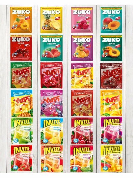 Ассорти растворимых напитков Zuko (Зуко), Yupi (Юпи), Invite (Инвайт) - 8 разных вкусов каждого напитка по 1 пакетику. Растворимый напиток Zuko, как и его собратья Yupi и Invite - это концентрированная смесь, из которой всего за несколько секунд можно сделать вкуснейший фруктовый напиток. Это один из привычных брендов начала 90-х годов и многие его помнят и по прежнему любят. Вернитесь в 90-е вместе с хитами того времени!