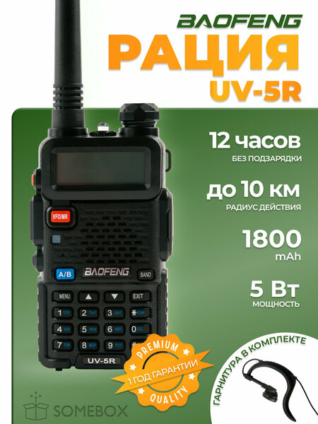 Рация Baofeng UV-5R 5 Вт – надежная и популярная модель, проверенная временем! Эта аналоговая baofeng радиостанция создана для тех, кто ценит надежность, качество и безопасность. В комплекте 1 рация взрослая. Мощность 5 Вт. Будьте всегда на связи в самых отдаленных уголках природы! С мощной рацией baofeng для похода вы всегда на связи с вашей командой. Пылевлагозащита IP54 обеспечит бесперебойную работу рации baofeng UV-5R даже в самых суровых условиях. Отправляйтесь в новые приключения, зная, что с вами надежная рация. Эта рация для детей и взрослых с большим радиусом действия до 10 км в открытых местах и до 7 км в лесу обеспечит четкую и стабильную связь. Рация baofeng с мощным аккумулятором на 1800 мАч позволит вам оставаться на связи 12 часов без подзарядки. Ваша работа требует высокого уровня защищенности и конфиденциальности переговоров? Военные рации обеспечат надежную передачу информации. 128 каналов и программируемые частоты помогут настроить рации детские под ваши нужды. Портативная рация для охоты работает в диапазонах VHF 136-174 Мгц и UHF 400-520 Мгц, что позволяет легко соединить данную детскую рацию на аккумуляторе с другими. Ударопрочность корпуса позволит вам использовать рацию в самых жестких условиях. Быстрая и стабильная связь раций взрослых на больших расстояниях обеспечит эффективное взаимодействие. Радиостанции baofeng не требуют регистрации в органах Роскомнадзора. Всё включено – в комплект к рации baofeng UV-5R входит всё необходимое для начала использования: аккумулятор, зарядный стакан и блок питания, антенна, клипса, ремешок, гарнитура и инструкция на англ. языке. Вам не нужно докупать аксессуары к рации – всё уже здесь! Кто выбирает рации baofeng? Военные, сотрудники спецслужб и охранники – когда связь может стоить жизни, важна максимальная бесперебойность. Охотники и рыболовы – уверенность, что рация не подведет в глуши и будет помощником для охоты. Туристы, альпинисты – возможность держать связь даже вдали от цивилизации во время туризма. Строители и сотрудники промышленных объектов – удобство работы со стабильным сигналом. Если вы хотите улучшить функциональность своей радиостанции baofeng, увеличить дальность связи и сделать её более удобной в использовании, обратите внимание на полезные аксессуары в нашем магазине: Аккумуляторная батарея – стандартная, усиленная (увеличенной емкости), запасная. Антенна для рации baofeng – для более стабильной связи на дальних расстояниях. Гарнитура для рации и тангента для рации – для комфортного общения в шумных условиях. Зарядное устройство для рации – чтобы всегда оставаться на связи. Рация военная мощная – это практичный и полезный подарок для охоты и охотника или как детская электроника, которым важна стабильная связь в любых условиях. Будьте уверены в надежной связи в любой ситуации с рацией baofeng UV-5R!