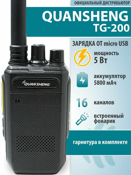 Бюджетная по цене новинка от надежного производителя! Рация Quansheng TG-200 - это стильная, компактная радиостанция, которая благодаря своим размером занимает мало места в рюкзаке и легко помещается в кармане. Несмотря на это, рация обладает хорошими характеристиками. Мощность передатчика рации до 5 Вт обеспечивает связь до 8 км на открытой местности. Аккумулятор имеет емкость 5800 мАч, благодаря чему радиостанция может работать до 56 часов без подзарядки. Рация работает в UHF диапазоне (400-470 МГц). Имеет 16 каналов памяти, функцию сканирования каналов, звуковое предупреждение о низком заряде батареи, функцию VOX (активации голосом). При помощи ПК можно запрограммировать: таймер ограничения передачи (TOT), регулируемое шумоподавление, CTCSS/DCS кодирование, выбрать широкую/узкую полосу пропускания, установить высокую или низкую мощность передатчика. Наличие LED фонарика - приятное и полезное дополнение. Рация имеет громкий динамик с чистым звуком. Для зарядки батареи Quansheng TG-200 используется микро-USB разъем. Благодаря ему рацию можно заряжать от любого источника питания, начиная от компьютера и заканчивая автомобильным адаптером. Прочный пластик, эргономичный дизайн, компактные габариты и вес рации, также обеспечат Вас ощущением комфорта и надежности. В комплекте идет сама рация, аккумулятор, антенна, провод микро-USB для зарядки, адаптер, гарнитура, клипса и шнурок на руку. Quansheng TG-200 является удобным и надежным средством связи для использования в различных ситуациях, например, на отдыхе, при охоте или рыбалке, на строительной площадке или в экстренных ситуациях. Рация проста в управлении и будет отличным подарком ребенку.