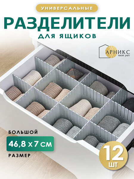 Комплект из 12-и разделительных полос для ящиков из высококачественных полимерных материалов - органайзер для хранения. Размер каждого разделителя 46,8х7 см, толщина 2 мм. Предназначены для организации пространства внутри мебельных ящиков, на полках, в холодильнике, на даче, на кухне, в спальне, в детской, в прихожей, в ванне, в шкафах и тд. Они обеспечивают простоту хранения вещей, игрушек, кухонных принадлежностей, посуды, помогают создать идеальный порядок, и удобный доступ к содержимому, а также являются прекрасным дополнением к интерьеру и отлично заменяют контейнеры для хранения. Разделители легко устанавливаются в ящиках любых размеров, длину можно регулировать путем разреза по нужным размерам и формировать разные ячейки. Толстый пластик обеспечивает прочность разделителей и их длительное использование. Набор разделителей станет прекрасным подарком в любой дом и на любой праздник (Новый Год, День Рождения, Новоселье, 8 марта, 14 февраля, День Учителя и тд).