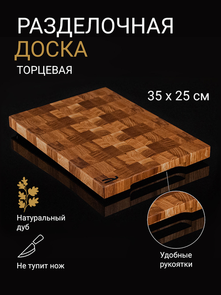 Эта разделочная доска из дуба отлично подойдет для большинства кухонь и станет незаменимой в приготовлении и подаче блюд. На ней удобно нарезать овощи и фрукты, разделывать курицу, а также резать и отбивать мясо. Дуб — прочный, красивый и надежный материал, устойчивый к деформации и повреждениям. Преимущества перед обычными досками: - Торцевой срез бережно относится к лезвию ножа: оно остаётся острым на 30–50% дольше, чем при работе с обычной доской. - Долговечность: срок службы — до 10 лет при правильном уходе - Толщина 2,5 см защищает от деформаций и растрескивания даже при воздействии тепла и пара - Быстро восстанавливает поверхность после контакта с ножом - Плотно прилегает к столу, не скользит во время работы - Идеальна для мяса — выдерживает удары поварского топорика и защищает столешницу Доска упакована в несколько слоёв стильной крафтовой бумаги — её можно дарить без дополнительной подготовки. Практичная и долговечная, она станет прекрасным подарком для любого кулинара. Мы заботимся о природе и используем только экологичные материалы, поддерживаем безотходное производство.