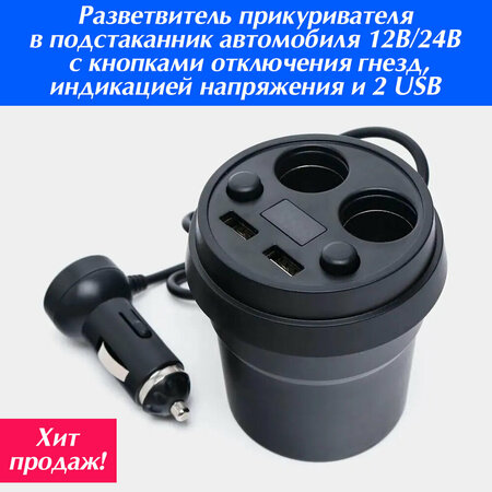 Данный разветвитель представляет собой устройство, вставляющееся в штатный автомобильный подстаканник и питающееся от прикуривателя. Оснащено 2 USB-портами и 2 гнездами прикуривателя. С помощью данного аксессуара Вы можете заряжать в пути свой смартфон, планшет, регистратор, запитывать любые автомобильные гаджеты. Особенности и характеристики: LED индикация силы тока и напряжения; Возможность подключения четырех устройств одновременно; Кнопки отключения гнезд прикуривателя; Корпус из прочного ABS-пластика; 2 USB порта; Рабочее напряжение 12В/24В; Г-образный штекер подключения, позволяющий сэкономить дополнительное пространство в салоне автомобиля; Размер: диаметр нижней части 60мм, высота до юбки 60мм, диаметр юбки 78мм, общая высота 82мм; Длина кабеля 65см.