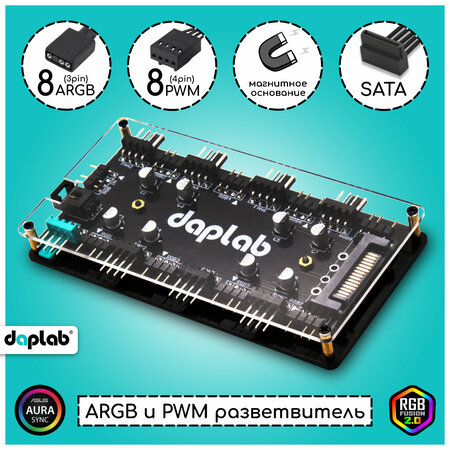 Многофункциональный разветвитель ARGB и PWM Hub от DAPLAB - управление освещением и вентиляторами в одном устройстве! Этот компактный, но мощный хаб от известного бренда DAPLAB предназначен для управления до 8 вентиляторами и ARGB освещением вашего компьютера, обеспечивая оптимальное решение для энтузиастов ПК, стремящихся к оптимизации охлаждения и эстетики системы. Основные характеристики: Количество подключаемых вентиляторов: до 8 штук. Тип подключения: 3-pin ARGB и 4-pin PWM. Питание: через SATA-разъем. Материал крепления: магнитное основание для простой и надежной установки. Входное напряжение: 12V. Максимальный ток: 4A для ARGB, 2A для PWM. Корпус: прочный пластик, защищающий электронные компоненты. Размеры: 100 мм (длина) x 70 мм (ширина) x 18 мм (высота). Преимущества использования: Простота установки: благодаря магнитному креплению и удобным разъемам, установка займет всего несколько минут. Улучшенное охлаждение: оптимизируйте воздушный поток внутри корпуса для лучшего охлаждения компонентов. Замечательная визуализация: добавьте яркие цвета и эффекты с помощью ARGB подсветки, управляемой через этот хаб. Идеально подходит для: Геймеров и профессионалов, желающих максимально контролировать систему охлаждения. Тех, кто хочет улучшить внешний вид своего ПК с помощью яркой подсветки. Получите контроль над каждым аспектом охлаждения и освещения вашей системы с многофункциональным разветвителем ARGB и PWM Hub от DAPLAB. Заказывайте сейчас и сделайте свой ПК более эффективным и стильным!