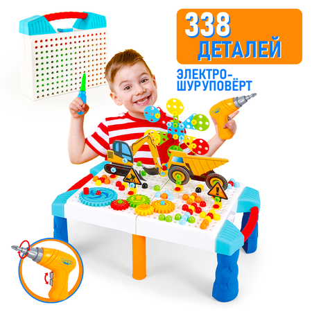Развивающий детский конструктор 3D с электрошуруповертом (2 насадки), работающим в 2-х режимах и 338 ярких деталей с шурупами и болтиками в чемодане + 3 карточки для создания не только плоских узоров, но и объемных фигур! Набор состоит из компактного чемодана, который легко трансформируется в рабочий столик. На рабочей поверхности можно составить более 35 комбинаций (2D и 3D) из мозаики, карточек, закрепляя их шурупами и гайками. Для крепления деталей конструктора можно использовать шуруповерт на батарейках, отвертку и гаечный ключ. В состав конструктора входят: 3 карточки со строительной техникой, пластиковые шурупы (2.5см) и гайки (1.2см), мозаика (2см), шестеренки (ср. размер 5.5см), геометрические фигуры (4.5см), инструкция. Размер чемоданчика: 26.5х8.5х23см. Размер собранного столика: 47х26.5х16см. Шуруповерт: 16х11.5см. Отвертка: 13см. Гаечный ключ: 11см.