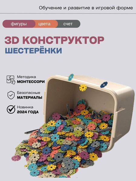 Развивающий инновационный детский конструктор "Шестеренки" Представляем вам уникальный 3D-конструктор "Шестеренки" – интерактивную игрушку, которая развивает фантазию и мышление у детей. Этот конструктор-мозаика – отличный вариант для игр и экспериментов, а также замечательное хобби для вашего ребенка. Преимущества 3D-конструктор "Шестеренки": Безопасный материал: Наш конструктор изготовлен из прочного, нетоксичного материала, который не имеет запаха. Острых граней нет, поэтому руки ребенка будут в полной безопасности. Крепкие конструкции: Все детали имеют отличное сцепление, что позволяет создавать прочные и устойчивые фигуры. Яркие цвета: Разноцветные детали точно заинтересуют ваших детей. Цвета яркие, не выгорают со временем. Многофункциональность: Этот многофункциональный развивающий конструктор пазл для детей развивает инженерное мышление, воображение, мозговую активность, логику, внимание, математическое и пространственное мышление, мелкую моторику рук, а также для улучшает зрительно-моторную координацию и стимулирование сенсорного развития. Большой набор: Поставляется в нескольких комплектациях – 200 и 400, 600 деталей. Вы можете собрать огромное количество конструкций – цветочки, деревья, машинки, животных, домики, замки, Фигурки, здания, как плоские, так и объемные. Можете построить целый город! Инструкция в комплекте: Можно воспользоваться инструкцией и составить фигуры по предложенным образцам. В комплекте идет мешок для хранения Для всех возрастов: Эта интерактивная игрушка подойдет как для самых маленьких, так и для подростков и даже для взрослых детей. Возрастная категория: 3-16 лет. Возьмите конструктор в школу, детский сад или игровую комнату – он подходит для игр Монтессори и групповых занятий. Постройте целый город вместе с "Шестеренками"!
