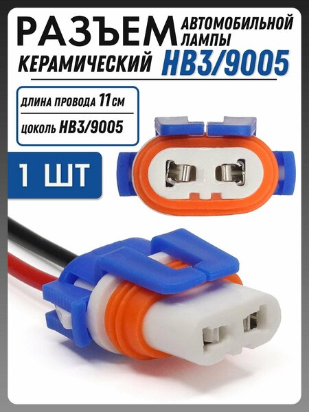Разъем автолампы керамический, автомобильный разъём цоколя HB3 для ламп серий P20d в сборе с 2-мя проводами 0,75 мм2 длиной 12 см и с герметичной уплотнительной резинкой. Керамический разъем устойчив к высоким температурам. Керамический цоколь не оплавится если вы установите лампы высокой мощности.