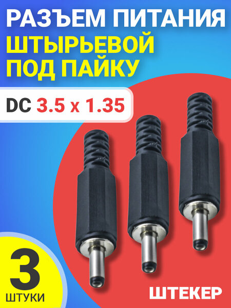 Разъем питания DC 3.5 x 1.35 штекер штырьевой под пайку пластик на кабель GSMIN JS05, 3шт (Черный)
