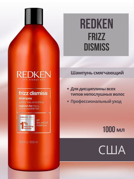 Redken Frizz Dismiss Shampoo - Шампунь для дисциплины всех типов непослушных волос 1000 мл Режим Frizz Dismiss - используется профессионалами для дисциплины всех типов непослушных волос. Содержит масло Бабассу и 1% Разглаживающий Комплекс. Redken предан науке здоровья волос: оптимальный баланс протеинов и увлажнения, поддержанный кислым уровнем pH. Упаковка из переработанного пластика Шампунь для гладкости и дисциплины волос FRIZZ DISMISS – защита от влажности и гладкость. Бережно очищает, делает волосы более послушными. На 85% более послушные волосы после применения. Подходит для волос, подвергающихся механическому, химическому и термическому воздействию, например, окрашиванию и кератиновому выпрямлению. Шампунь не содержит сульфатов и хлорида натрия. Способ применения: используйте полную систему с кондиционером Frizz Dismiss. Нанести шампунь на влажные волосы, вспенить, тщательно смыть. После шампуня использовать кондиционер. При попадании в глаза немедленно промыть водой. Объём: 1000 мл