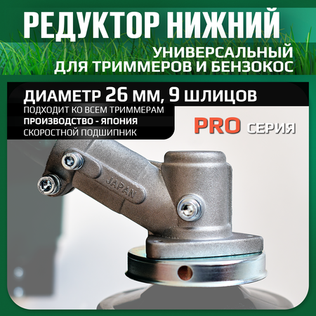 Редуктор идеально подходит для использования с триммерами различных брендов, обеспечивая долгий срок службы и надежную работу. Основные характеристики - Материал: высокопрочный алюминиевый сплав AlSi9Cu3, устойчивый к коррозии и рассчитанный на высокую прочность. - Совместимость: подходит для большинства брендов триммеров (Huter, Ресанта, Favourite, Carver, Oasis, Sturm, Сибртех, Champion, Patriot, PIT, Brait, Edon, Redverg). - Размеры: диаметр посадки 26 мм, 9 шлицов. Преимущества и надежность - Антивибрационная система: обеспечивает комфортную работу с минимальной нагрузкой на оператора. - Смазка: профессиональная смазка Shell Gadus S2 U, рассчитанная на весь срок службы редуктора. - Защита: эффективно предотвращает попадание травы и посторонних частиц в механизм. Комплектация В комплект входят: - Шайбы, гайки, болты. - Усиленные подшипники SKF – гарантия долговечной работы механизма. Производство Редуктор произведен в Японии, что гарантирует высокий уровень качества и надежности. Этот универсальный редуктор станет отличным выбором для замены или модернизации триммера, значительно улучшая его функциональность и удобство использования.