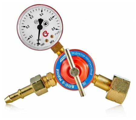 Редуктор пропановый БПО-5 мини предназначен для понижения давления газа, поступающего из баллона, и автоматического поддержания постоянным заданного рабочего давления при газопламенной обработке. Производит тонкую настройку рабочего давления, особенно на малых величинах. Корпус редуктора изготовлен из алюминия. Специальная линейка редукторов мини за счет своих уменьшенных габаритов и облегченной конструкции подойдет для передвижных газосварочных постов и для эксплуатации на небольших предприятиях с низкочастотным использованием устройства. Особенности: Редуктор укомплектован универсальным ниппелем, что позволяет использовать резинотканевые рукава с внутренним диаметром 6 и 9 мм без дополнительных переходников. Редуктор упакован в индивидуальную картонную коробку, что исключает бой манометра и обеспечивает сохранность комплектации во время транспортировки и хранения на складе. Редуцирующий газ: Пропан Наибольшая пропускная способность, м³/ч:5 Наибольшее давление газа на входе, МПа (кгс/см²):2,5 (25) Наибольшее рабочее давление газа, МПа (кгс/см²):0,3 (3,0) Присоединение к баллону:Радиальное Присоединительные размеры на входе - гайка накидная с внутренней резьбой:СП-21,8LH Присоединительные размеры на выходе - штуцер с гайкой (резьба) и ниппель (ø мм):M16х1,5LH и ниппель 6/9 Вес нетто, кг:0,34 Габариты редуктора в собранном виде, мм:145х110х100 Вес брутто, кг:0,45 Габариты индивидуальной упаковки, мм:115х105х12
