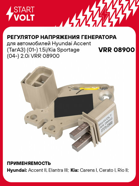 Регулятор напряжения генератора для автомобилей Hyundai Accent (ТагАЗ) (01-) 1.5i/Kia Sportage (04-) 2.0i Характеристики: Артикул: VRR 08900 OEM номера: 37370-22650, 37370-22651, M535 Тип питания: Статор Количество на автомобиль: 1 Номинальное напряжение, В: 14 Сила тока, А: 5 Тип сигнала: L Подходит для авто: Hyundai Accent II (99-), Elantra III (00-), i30 I (07-), Tucson I (04-), Getz (02-) Kia Carens I (99-), Cerato I (04-), Rio II (05-), Sportage II (04-), Spectra (00-) Для проверки применяемости отправьте VIN автомобиля через вкладку "Есть вопросы о товаре?" Комплектация: Паспорт изделия/гарантийный талон - 1 шт. Регулятор напряжения генератора - 1 шт. Гарантия: от 1 года.