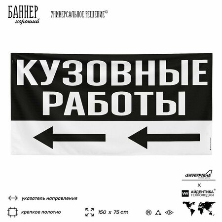 Рекламная вывеска баннер Кузовные работы, 150x75 см, с указателем, для автосервиса, черный, SIlverPlane x Айдентика Технолоджи