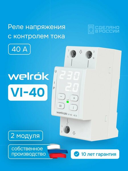 Welrok VI Реле напряжения с контролем тока Welrok VI red защищает оборудование от скачков и провалов напряжения, последствий обрыва нулевого провода и превышения тока или мощности. Реле отключает нагрузку, если напряжение, ток или мощность выходит за установленные пределы и автоматически включает нагрузку, когда значение параметра вернется в норму. Гарантия 10 лет На все реле Welrok действует 10-летняя гарантия от производителя. 3 дополнительных преимущества, которые дает контроль по току в реле: 1. Возможность точного ограничения мощности нагрузки; 2. Возможность равномерно распределить нагрузку по фазам; 3. Визуальный контроль за текущим состоянием нагрузки. Максимальная функциональность Welrok VI — компактное реле на 2 модуля с мощным функционалом: ● Позволяет выбрать, по какому из параметров — ток или мощность — будет срабатывать защита вместе с защитой по напряжению. ● Скорость срабатывания реле < 0,03 сек. ● TrueRMS для точного измерения напряжения Для уменьшения количества срабатываний: ● Защита от частых срабатываний ● Регулируемый гистерезис ● Регулируемая задержка включения нагрузки ● Профессиональная модель отключения при выходе напряжения за пределы Для анализа питающей сети по характеру аварийных срабатываний: ● Журнал срабатываний на 100 значений Для комфортной и безопасной эксплуатации: ● Поправка напряжения и тока на экране ● Регулировка яркости экрана ● Защита от перегрева Корпус реле напряжения изготовлен из пластика, не поддерживающего горение. Простая установка и удобное управление Реле подключается без транзита нуля. Настройка реле осуществляется с помощью трех кнопок: « » (меню) и « ➖ », « ➕ ». Чтобы увидеть расшифровки аббревиатур, достаточно нажать кнопку « ℹ️ ».