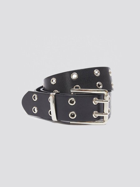 Ремень из экокожи с двойным рядом люверсов: стильный аксессуар для женщин Ремень из экокожи с двойным рядом люверсов – стильный и практичный аксессуар для создания модных образов. Выполненный в серебристом и черном цветах, он станет отличным дополнением к джинсам или платьям. Ремень изготовлен из качественной экокожи, которая обеспечивает долговечность и комфорт в использовании. Ширина изделия составляет 3,5 см, что делает его удобным и практичным для повседневной носки. Модель оснащена прямоугольной пряжкой и шлёвкой из металла, выполненной в цвете "серебро". Это придает ремню особый шик и элегантность. Ремень подходит для женщин и имеет размер XS (94 см). Ремень из экокожи с двойным рядом люверсов – это стильный, удобный и практичный аксессуар, который станет отличным подарком для коллеги-женщины, подруги или родственницы.