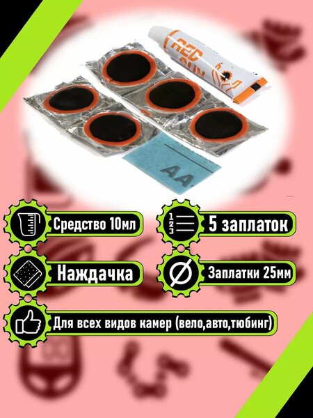Ремкомплект с заплатками для ремонта камер любого типа, велосипедных, автомобильных, камеры коляски или ватрушки и тюбинга. В комплекте 5 заплаток, диаметр каждой заплатки 25 мм. Также комплект включает наждачку и средство для активации заплаток 10 мл. Для наилучшего результата, поверхность вокруг дырки в камере необходимо зачистить шкуркой, нанести первый слой средства для активации заплаток и подождать 5 минут. Затем нанести второй слой и выждать еще 2-3 минуты. После этого приклеить заплатку, предварительно сняв алюминиевую защитную пленку, и сильно прижать. Лучше оставить под прессом на 12 часов. С помощью данного набора заплаток для камер можно заклеить абсолютно любую камеру на горном, детском, взрослом, спортивном или дорожном велосипеде, а также на детской или инвалидной коляске. А также ваша ватрушка или тюбинг обретут вторую жизнь! Универсальный ремкомплект для велосипеда станет надежным помощником в устранении проколов камер и шин. В наборе предусмотрены резиновые заплатки разной формы, самоклеящиеся латки и клей, обеспечивающие быструю герметизацию повреждений. Компактный и удобный формат позволяет легко брать комплект с собой на прогулку или тренировку. Он подходит как для ремонта велосипедных камер, так и для восстановления других резиновых изделий, включая надувные элементы. Прочные материалы гарантируют долговечность заплаток после использования. Этот набор поможет оперативно устранить неполадки и продолжить путь без необходимости обращаться за помощью. Незаменимый аксессуар для активного велоспорта, ежедневных поездок или дальних путешествий. Простота применения делает комплект подходящим даже для новичков. Позаботьтесь о своем комфорте и безопасности с этим практичным решением!