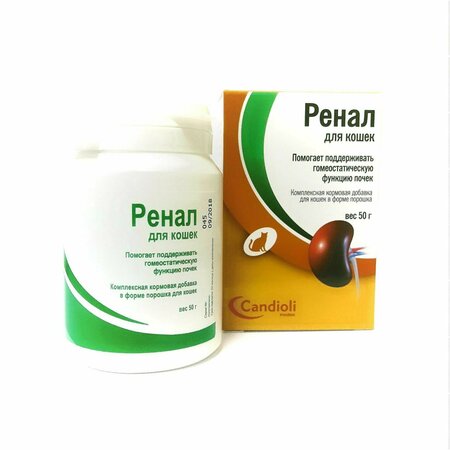 Особенно рекомендуется для поддержания функции почек, одинаково на ранних и поздних стадиях хранической почечной недостаточности у кошек. Ренал для кошек может контролировать метаболические дисбалансы, вызванные хронической почечной недостаточностью. Компоненты препарата связывают излишки фосфатов в пище (карбонат кальция) и кальция в моче (цитрат калия), снижая их биологическую доступность, способствуют связыванию умеренных токсинов (хитозан) и улучшению состояния животного. Карбонат кальция образует с фосфатами корма прочные нерастворимые соединения, помогает поддерживать баланс кальциево-фосфорного обмена в организме и оказывает алколизирующее действие. Цитрат калия связывает кальций в моче, предотвращая тем самым его кристаллизацию и образование почечных камней. Хитозан связывает желчные кислоты в кишечнике животного, что способствует снижению уровня холестерина в сыворотке крови, а также повышает уровень гемоглобина в крови.