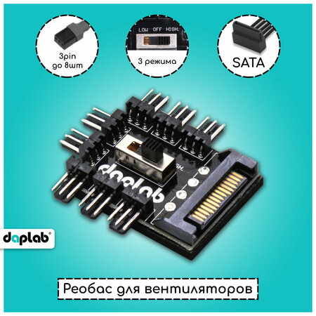 Реобс для 8 кулеров с регулировкой оборотов Описание: Реобас на 8 кулеров обеспечивает превосходное управление охлаждением вашего ПК. Этот компактный и эффективный хаб позволяет контролировать скорость до 8 вентиляторов, оптимизируя работу системы и минимизируя шум. Идеален для геймеров и профессионалов, которым необходимо дополнительное охлаждение для стабильной работы их систем. Основные характеристики: Модель: Daplab Fan Hub Количество портов: 8 для кулеров Питание: SATA Контроль скорости: Регулировка оборотов Совместимость: Поддержка стандартных кулеров с 3-pin и 4-pin подключениями Материал корпуса: Высокопрочный пластик Цвет: Черный Преимущества товара: Эффективное управление охлаждением: Позволяет подключить до 8 кулеров, что оптимизирует охлаждение компьютера. Гибкая регулировка скорости: Управляйте скоростью кулеров в зависимости от нагрузки на систему, обеспечивая идеальное сочетание эффективности и тишины. Простая инсталляция: Легко подключается к источнику питания через SATA и не требует дополнительного ПО. Универсальная совместимость: Поддерживает как 3-pin, так и 4-pin кулеры, делая его подходящим для большинства существующих систем.