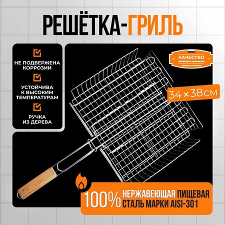 Сделано в России, г. Павлово — там, где мастерство с металлом доведено до совершенства. Решетка-гриль из пищевой нержавеющей стали AISI 304 создана для комфортного приготовления мяса, рыбы, овощей и других блюд. Без покрытия — только чистый вкус еды, без вредных добавок. Удобный фиксатор надежно держит крышку, а деревянная ручка из березы остается холодной. Усиленная конструкция решетки создает жесткий каркас, защищает от деформации. Толщина прутка каркаса 5мм, основной сетки 3мм. Размер решетки Ш 380 мм Д 340 мм Г60 мм общая длина с ручкоц 650 мм. Внутренний размер рабочей поверхности Ш380 мм, Д340 мм, Г 60 ми глубина рабочей поверхности регулируется по высоте.