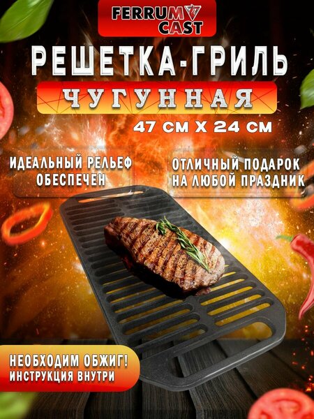 Решетка-гриль выполнена из экологически чистого и безопасного металла - чугуна и предназначена для приготовления блюд барбекю. Рабочая поверхность - 385х240 мм. Габаритные размеры: 470х240х10 мм. Масса - 3,9 кг. Чугунные изделия обладают естественными антипригарными свойствами. За счет низкой теплопроводности и высокой теплоемкости изделие равномерно прогревается по всей поверхности и долго сохраняет тепло. Перед первым использованием решетки необходимо: 1) вымыть изделие в теплой воде мягкой губкой с применением жидкого моющего средства 2) вытереть изделие насухо 3) нагреть решетку для удаления остатков влаги 4) смазать поверхность изделия растительным маслом (лучше всего использовать льняное) и дать остыть. Использование и уход: Чугунную решетку мыть не обязательно. После каждого использования нужно удалить с поверхности пригоревшие остатки пищи. Перед следующим использованием, после нагрева решетки ее поверхность просто нужно протереть жесткой щеткой, после чего смазать растительным маслом. При неправильной эксплуатации или хранении чугунной решетки, на ее поверхности возможно появление ржавчины. Однако это не является дефектом. Ржавчину можно легко удалить металлической щеткой, после чего необходимо обработать поверхность растительным маслом.