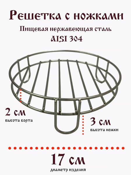 Прочная нержавеющая сталь: Изготовлена из пищевой стали AISI 304 — безопасна для здоровья, устойчива к коррозии и деформации. Выдерживает нагрев до 450°C. ЭлектроХимическая Полировка: Готовьте без масла! Легко очищается от нагара, подходит для мытья в посудомоечной машине. Оптимальная циркуляция воздуха: Уникальный дизайн ячеек обеспечивает равномерное распределение горячего воздуха — блюда пропекаются со всех сторон. Технические характеристики: - Материал: нержавеющая сталь AISI 304 - Размер: 17 см диаметр - Высота ножек : 3 см - Цвет: серебристый - Толщина прутка: 3 мм. - Высота борта: 2 см Для кого это? - Для любителей здорового питания — минимум масла, максимум пользы! - Для тех, кто ценит долговечность — решётка прослужит годы даже при ежедневном использовании. - Для владельцев аэрогрилей, которые хотят расширить функционал — готовьте овощи, мясо, рыбу и выпечку без пригорания! Отлично подходит - для электрических аэрогрилей, духовок, хлебопечей, коптилен, угольных и газовых грилей. Отправление упаковано - курьерский пакет для отправлений. В нашем профиле представлены решетки разных размеров и с разной высотой ножек (3 и 6 см) , так же есть модели в квадратном исполнении! С дополнительным бортиком и без.