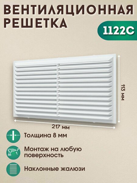 Решетка вентиляционная вытяжная Era С имеет наименьшую толщину - всего 8 мм. Предназначена для декоративного оформления выходов приточных или вытяжных вентиляционных систем бытовых, общественных и промышленных зданий. В данной серии есть белые, бежевые и коричневые исполнения, блягодаря чему можно выбрать решетку под цвет мебели. Применяется для настенного или потолочного монтажа, монтаж с помощью клея. Размер 217 х 113 мм.
