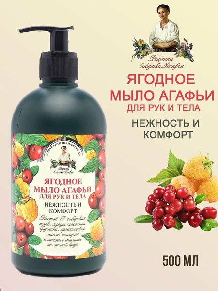 Комментарий:Продукцией "Рецепты бабушки Агафьи" пользуемся очень давно. Это жидкое мыло нравится нам своим натуральным составом, нежным ягодным запахом и комфортностью. Спасибо производителю.