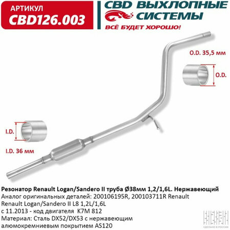 Резонатор Cbd для Renault Logan/Sandero II труба O38мм 1,2/1,6L, нержавеющая сталь, 126.003