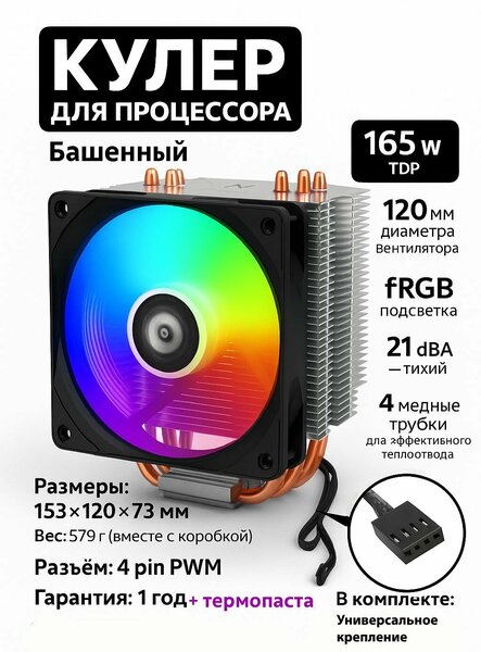 ✅внимание! кулер совместим с сокетами: AMD AM2, AM2+, AM3, AM3+, AM4, FM1, FM2, LGA 1150, LGA 1151, LGA 1151-v2, LGA 1155, LGA 1156, LGA 1200, LGA 1366, LGA 2011, LGA 2011-3, LGA 775, LGA 754, LGA 1700✅ Если у вас LGA 2011 старого образца с узкими креплениями Narrow ILM 94 на 56 то универсальное кольцо не подойдет! Если же современная LGA 2011 с 80 на 80 Всё шикарно подойдет! Этот кулер для процессора является лучшим в своей ценовой категории Кулер имеет башенную конструкцию и TDP в 165 Вт. Он универсально подходит для процессоров Intel и AMD. Уровень шума составляет от 16 дБ, скорость вращения вентилятора - 1600 об/мин, размер вентилятора - 120 мм, коннектор - 4 pin (также совместим с материнскими платами с 3 pin). Радиатор выполнен из нового поколения меди и алюминия. Модель имеет современный радиатор из алюминия, который контактирует с процессором с помощью медного основания. Тепло отводится при помощи 4 медных трубок. Максимальное шумовое поколение составляет 16 дБ при скорости вращения в пределах 1600 об/мин. Этот воздушный поток обеспечивает охлаждение процессора воздухом с потоком в 48 CFM, что более чем достаточно для нормальной работы процессора. В коробке в комплекте также есть переходник на другие сокеты и термопаста в подарок. Он оснащен мощными подшипниками, которые обеспечивают тихую и долговечную работу. Он гарантирует безопасность процессора от перегрева и обеспечивает стабильную работу компьютера. Рассеиваемая мощность - 165 Вт; Тип конструкции - башенный; Материал основания - алюминий\медь; Материал радиатора - алюминий; Количество тепловых трубок - 4; Никелированное покрытие - радиатор, тепловые трубки; Вентилятор: Разъем для подключения вентиляторов - 4-pin; Количество вентиляторов в комплекте - 1; Максимальное число устанавливаемых вентиляторов - 2; Максимальная скорость вращения - 1600 об/мин; Минимальная скорость вращения - 900 об/мин; Регулировка скорости вращения - автоматическая (PWM); Максимальный уровень шума - 21 дБ;
