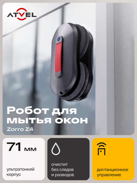 Atvel Zorro Z4 – компактный робот мойщик, очищающий окна, любые остекления с рамами, зеркала и шкафы-купе. Обладает ультратонким корпусом высотой 71 мм, поэтому его можно свободно использовать на окнах с решётками, на межоконных пространствах и вблизи веток деревьев. Корпус оборудован датчиками рамы, поэтому мойщик отлично ориентируется на стекле и не оставляет непромытых участков, а после окончания уборки возвращается на место старта. Вакуум в 2800 Па надёжно удерживает робот для чистки стекла на поверхности. Стеклоочиститель имеет бесщёточный мотор. Он надёжный и долговечный. Дизайн робота для мытья окон продуман до мелочей. Прочный пластик серебристого цвета не выгорает и не темнеет на солнце. Стильная гибкая ручка со слайдером позволяет комфортно держать робот в руке, а также помещать его на стекло без страха выронить. Кнопка включения находится прямо под большим пальцем, поэтому робот можно запускать одной рукой, что особенно удобно и безопасно при мытье глухих окон. Zorro Z4 имеет три режима работы: – автоматический: сначала вверх, потом вниз – локальный: сначала влево, потом вниз – локальный: сначала вправо, потом вниз Роботом для мойки окон можно управлять в ручной режиме с помощью пульта дистанционного управления. В ручном режиме можно мыть, в том числе и безрамные пространства. Zorro Z4 передвигается по стеклу с помощью колёс. Вращение колёс с салфетками из микрофибры обеспечивает лучшее оттирание загрязнений, даже если они подсохшие и застарелые. Аппарат не оставляет разводов, тщательно полирует поверхность и делает стекло прозрачным после уборки. Для лучшего эффекта очищения рекомендуется наносить на салфетки специальное моющее средство от Atvel. Для безопасности в комплекте с устройством идёт страховочный трос. Вместе с адаптером и удлинителем их длина достигает 5 м, позволяя мыть даже панорамные окна. Для большей безопасности устройство оснащено резервным аккумулятором, который необходимо зарядить перед уборкой. В случае отключения электричества окномойка не упадёт вниз, а будет удерживаться на стекле в течение 15 мин, подавая аварийный сигнал. Машинка для мойки окон работает тихо и не потревожит шумом. Уровень шума низкий: менее 65 дБ. В комплект входит сам робот мойщик, страховочный трос, адаптер, 10 сменных салфеток, пульт управления, а также ёмкость с распылителем. Профессиональная бытовая техника для дома Atvel - идеальный выбор в качестве подарка в день рождения, юбилей, новоселье или другие праздники. Этот универсальный подарок станет отличным сюрпризом для любого другого повода. Это устройство будет лучшим по своей функциональности и стильному дизайну. Благодаря его предпочтительным характеристикам, оно обеспечит комфорт и радость как мамочке в домашнем хозяйстве, так и начальнику на работе. Идея для подарка, которая порадует каждого: от подруги до мужчины или женщины на свадебное торжество. Уникальный подарок для девушки или парня, который обязательно придется по вкусу. Прекрасный выбор не только для жены или мужа на высокий юбилей, но и для бабушки или руководителя. Несомненно что это станет прекрасной заботой для всех: от воспитателей до мужа. Подарите красивый прибор Atvel как символ вашего внимания и заботы вашей любимой.