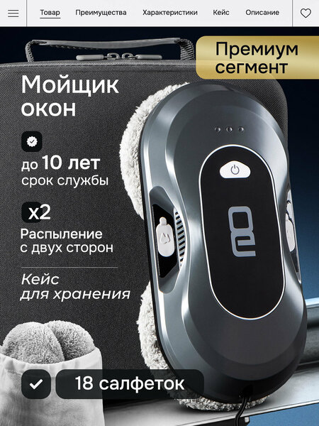 Эволюция в мире роботов мойщиков. Стиль и эргономика в каждой детали. Премиальный внешний вид. Двойное распыление гарантирует тщательную очистку поверхности, равномерно распределяя жидкость. Работа по безрамным поверхностям, удобный кейс для хранения. Практичное решение для любого интерьера. Робот оснащен мощным бесщеточным двигателем, что позволяет ему эффективно справляться с задачей на разных видах поверхностей. Несмотря на свою производительность, он работает тихо, не нарушая домашнего уюта и спокойствия. Это особенно полезно в жилых помещениях или офисах, где шум может мешать комфортной обстановке. Продуманная эргономика устройства делает его использование интуитивно понятным и удобным. Качественный кейс служит отличным хранилищем, которое поддерживает порядок и защищает устройство от пыли и повреждений вне работы.