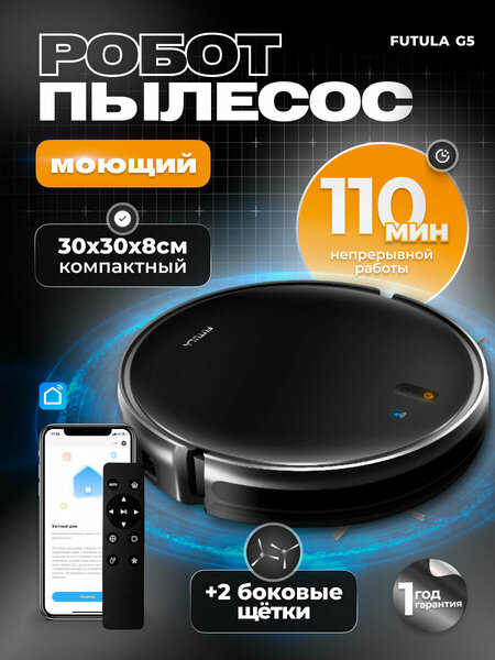Робот-пылесос моющий Futula Robot Vacuum Cleaner and Mop G5 черный, сухая/влажная уборка, управление через смартфон