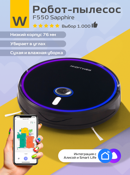 Робот пылесос Wollmer F550 Sapphire - это идеальный робот для тех, кто хочет поддерживать чистоту в доме без лишних усилий. Он обладает всеми необходимыми функциями для эффективной уборки: сухой и влажной, с возможностью построения карты помещения, программированием по дням недели и сигналом при застревании. Благодаря мягкому бамперу и датчикам перепада высоты, он аккуратно объезжает препятствия и не повреждает мебель. Робот пылесос оснащен 4 режимами уборки, включая местную уборку, турборежим и движение вдоль стен. Управление осуществляется через пульт ДУ или смартфон, что позволяет контролировать процесс уборки из любой точки дома. В комплекте вы найдете все необходимые аксессуары для уборки, такие как боковая щетка, турбощетка, универсальная насадка для мокрой уборки и щеточка для чистки. Одним из главных преимуществ робота пылесоса Wollmer является его аккумуляторная батарея емкостью 3200 мАч, что обеспечивает до 150 минут работы. Время зарядки составляет 240 минут, что делает его удобным для использования в любое время дня. Пылесборник состоит из контейнера для мусора и воды, которые легко снимаются и очищаются. Фильтр тонкой очистки HEPA-13 позволяет улавливать мелкие частицы пыли и аллергены. Wollmer F550 Sapphire также оснащен уникальными технологиями Smart Track, которые позволяют ему более точно определять маршрут уборки и избегать препятствий. Датчик TOF помогает ему ориентироваться в пространстве и строить карту помещения. Количество датчиков составляет 5 штук, благодаря чему он может объезжать препятствия и не падать со ступенек. Этот робот пылесос идеально подходит для тех, кому нужна эффективная уборка дома без лишних усилий и затрат времени. Он работает в системе умного дома, поддерживая связь с устройствами через Wi-Fi, и может управляться через голосовые помощники, такие как Алиса, Маруся и Алекса. С помощью этого робота пылесоса вы сможете быстро и легко поддерживать чистоту и порядок в вашем доме, экономя время и силы.
