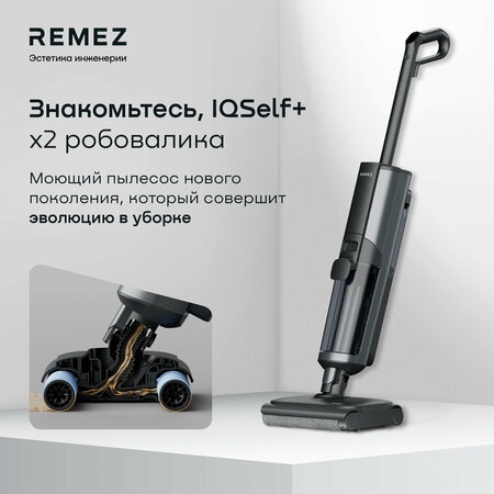 Любые типы загрязнений. Любые типы твердых покрытий. Новое поколение вертикальных моющих пылесосов с роботизированными процессами уборки, очищения, сушки. Модель моющего пылесоса REMEZ IQSelf+ RMVC-603 отличается от REMEZ IQSelf RMVC-601 базой (база - это станция для зарядки и самоочистки пылесоса). По техническим характеристикам модели пылесосов идентичны друг другу. IQSelf x2 робо-валика - новое поколение вертикальных моющих пылесосов с роботизированными процессами уборки и самоочистки. При использовании пылесоса с одним валиком до 80% покупателей отмечали следы остаточной влаги и разводы на полу. IQSelf x2 робо-валика решает эту проблему. IQSelf очищает поверхность от пыли, сухих и жидких загрязнений, застарелых пятен, но совершенно безопасен для влажной уборки на покрытиях пола из натурального дерева или ламината, требующих самого деликатного отношения. Гарантия REMEZ от мокрых пятен и разводов. 6 роботизированных технологий для уборки с эффективностью свыше 100%. По сравнению с вертикальными моющими пылесосами с одним валиком. Только что помытый пол будет еще до 58% чище после контрольной уборки пылесосом IQSelf. Протестировано. Доказано.* Какие решения повышают эффективность уборки? х 2 робо-валика. Конструкция параллельно расположенных валиков с разнонаправленным вращением Win2Win Design. Ведущий валик вращается со скоростью 380 об/мин, захватывая до 75% сухих и жидких загрязнений. Контрольный валик вращается со скоростью 320 об/мин и захватывает до 56% загрязнений, включая те, которые не может захватить ведущий валик, одновременно подсушивает поверхность, оставляя за собой на чистый пол без разводов, остаточных загрязнений и лишней влаги. Автоматическое очищение валиков во время уборки SelfGo&Clean Technology Комбинация жестких и плавающих скребков, - по 3 на каждый валик, производит их очищение от избыточной влаги, комкующегося мусора и волос прямо во время уборки, направляя загрязнения во всасывающие каналы пылесоса. 24 форсунки подачи воды - еще более равномерное смачивание валиков, позволяет улучшить качество уборки еще на 20%*. Рекордная сила всасывания до 20 000 Па. Среди самых высоких показателей среди беспроводных моющих пылесосов. До 40 минут уборки и до 200 м2 без подзарядки аккумулятора. Время полной зарядки 4.5 часа. Интеллектуальные режимы уборки Smart Mode и Smart Disinfecting Mode. Получая информацию о количестве поступающих загрязнений пылесос сам регулирует силу всасывания и количество воды, подаваемой на оба валика. Чем больше загрязнений, тем сильнее сила всасывания и больше воды подается на ведущий и контрольный валики. В режиме Smart Disinfecting Mode предварительно происходит автоматическая дезинфекция воды методом электролиза. Это совершенно экологичный и безопасный способ дезинфекции воды от вирусов и бактерий с качеством очистки 99,99%. Далее уборка производится в интеллектуальном режиме Smart Mode. Специальный режим Delicate Mode для уборки покрытий, гиперчувствительных к влаге. Разработан совместно со специалистами по клинингу и рекомендован для влажной уборки паркета, ламината, массивной, инженерной доски. "Парящий" ход и ни с чем несравнимое невесомое управление пылесосом. Вес пылесоса более 5 килограмм при управлении ощущается, менее 1 килограмма. Специально утяжеленный моющий блок имеет до 2х раз лучшую прижимную силу к поверхности пола, обеспечивая лучшее сцепление с поверхностью 