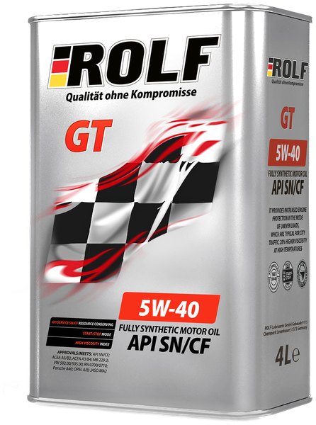 Масло моторное синтетическое ROLF GT SAE 5W-40, API SN/CF подходит для всесезонного применения в бензиновых и дизельных двигателях, в которых производитель рекомендует использовать смазочные материалы спецификаций API SN/CF, ACEA A3/B3, A3/B4 или более ранних, класса вязкости SAE 5W-40. Демонстрирует превосходную защиту от отложений даже при самых долгих интервалах замены масла, рекомендуемых производителем двигателя. Обладает отличными моющими свойствами, сокращая образование низкотемпературных отложений. Благодаря синтетическим базовым маслам обеспечивает повышенную защиту двигателя от износа в процессе холодного пуска и при эксплуатации в режиме максимальных нагрузок.