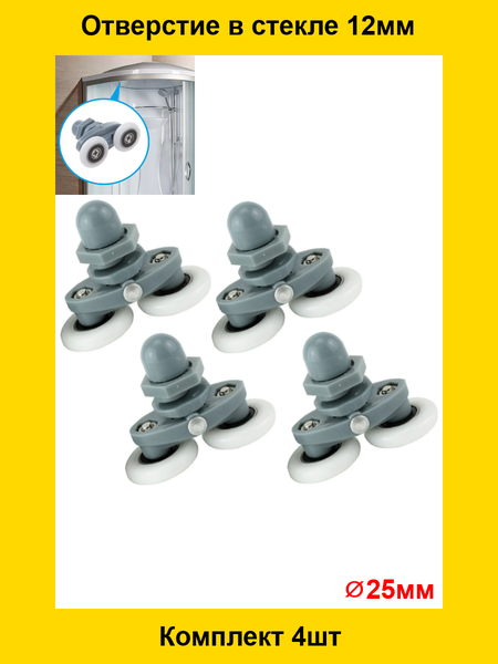 Ролик универсальный двойной эксцентриком для крепления двери душевой кабины. Характеристики товара: Отверстие в стекле: 11-12 мм; Толщина стекла: 4-6 мм; Колесико: съёмное; Цвет: серый; Вес: 20 г. Ролики для душевой кабины 25мм, которые обеспечат плавное открывание и закрывание дверей вашего душа. Эти двойные ролики с эксцентриком идеально подойдут для кабин любого размера и дизайна. Изготовленные из высококачественного алюминиевого сплава и пластика, ролики обладают прочностью и долговечностью.