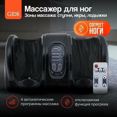 Роликовый массажёр для ног GESS Bliss, с ИК-прогревом — профессиональный уход у вас дома GESS Bliss — это электрический массажёр для стоп и голени с 4 автоматическими программами и функцией инфракрасного прогрева, созданный для снятия усталости, улучшения кровообращения и расслабления после тяжёлого дня. Преимущества и функции: • 4 режима массажа — для эффективного снятия мышечного напряжения и усталости. • ИК-прогрев — глубокое прогревание улучшает кровообращение, снимает стресс и повышает тонус. • Автоматическое отключение — безопасность и экономия энергии (через 15 минут). • Пульт управления — удобно менять режимы, не наклоняясь. • Подходит для всех размеров стоп — универсальная конструкция. • Ручной режим — можно самостоятельно выбрать направление и интенсивность вращения. Технология: • Комбинация роликового и акупунктурного массажа стимулирует активные точки на стопе. • Подходит для использования дома, в офисе или в салоне красоты. Идеален как подарок Поставляется в стильной упаковке — отличный выбор для подарка родителям, близким или себе. Комплектация: • Массажёр GESS Bliss • Пульт управления • Инструкция • Гарантийный талон • Коробка Габариты и параметры: • Мощность: 40 Вт • Размеры: 35 × 27 см • Вес: около 4 кг • Материал: пластик • Цвет: чёрный • Питание: от сети • Гарантия: 12 месяцев